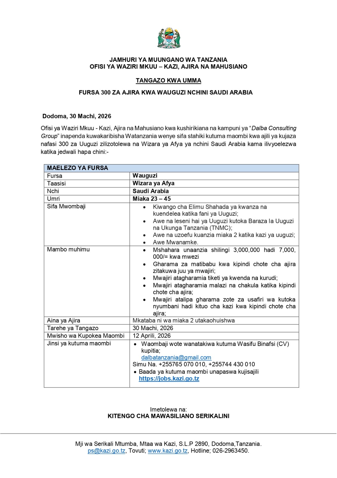 Fursa 300 za Ajira kwa Wauguzi Nchini Saudi Arabia